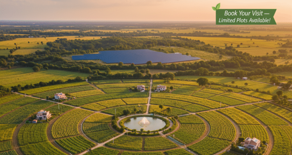 Eco-farmland combines modern sustainability with rural charm. At Dhanveda Farmlands, each plot is designed to preserve groundwater, promote biodiversity, and use organic inputs.