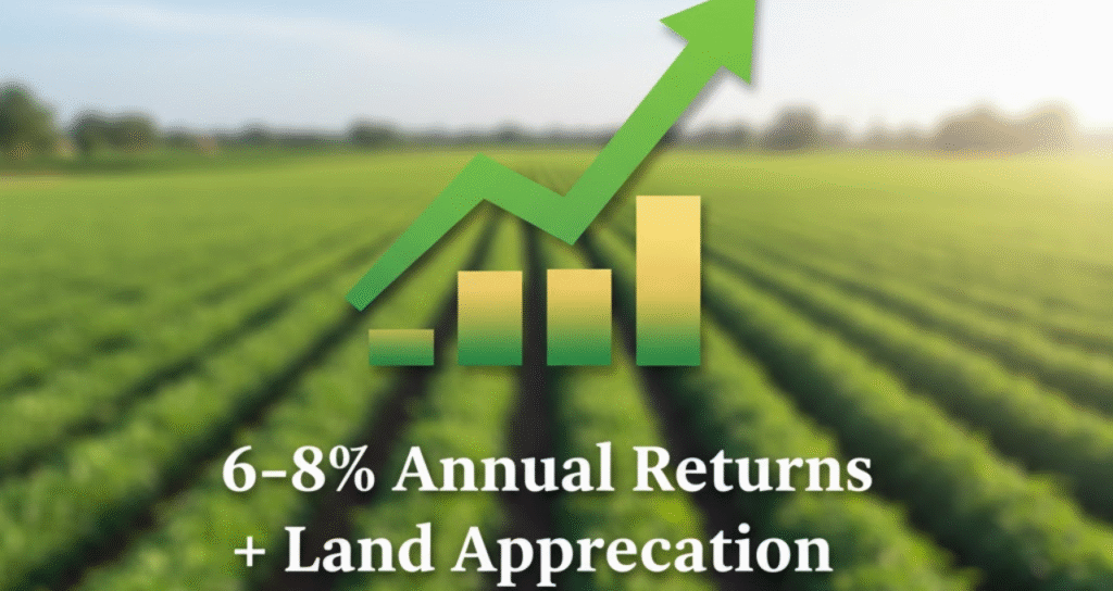 Managed farmland typically yields 6–8 % per year, plus long-term land appreciation.