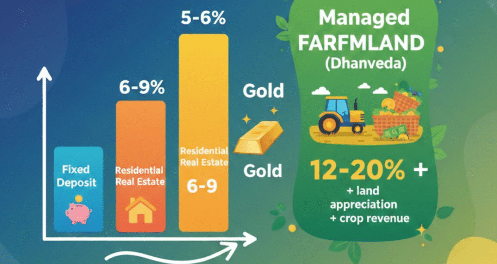 Unlike volatile real estate and stock markets, agricultural land has never declined in long-term value. With rising food demand, export growth, and limited farmland availability near major cities, managed farmlands are becoming the smartest investment choice for 2025 and beyond.